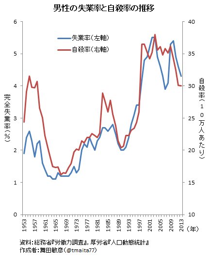 失業問題は自殺との関係が深い。有効求人倍率と自殺率には強い負相関が存在し[15]、従業員5人未満の零細企業の倒産件数は自殺率と強い正の相関がある[15]。